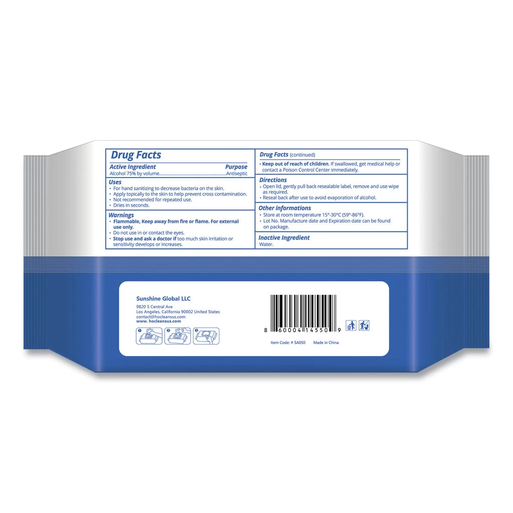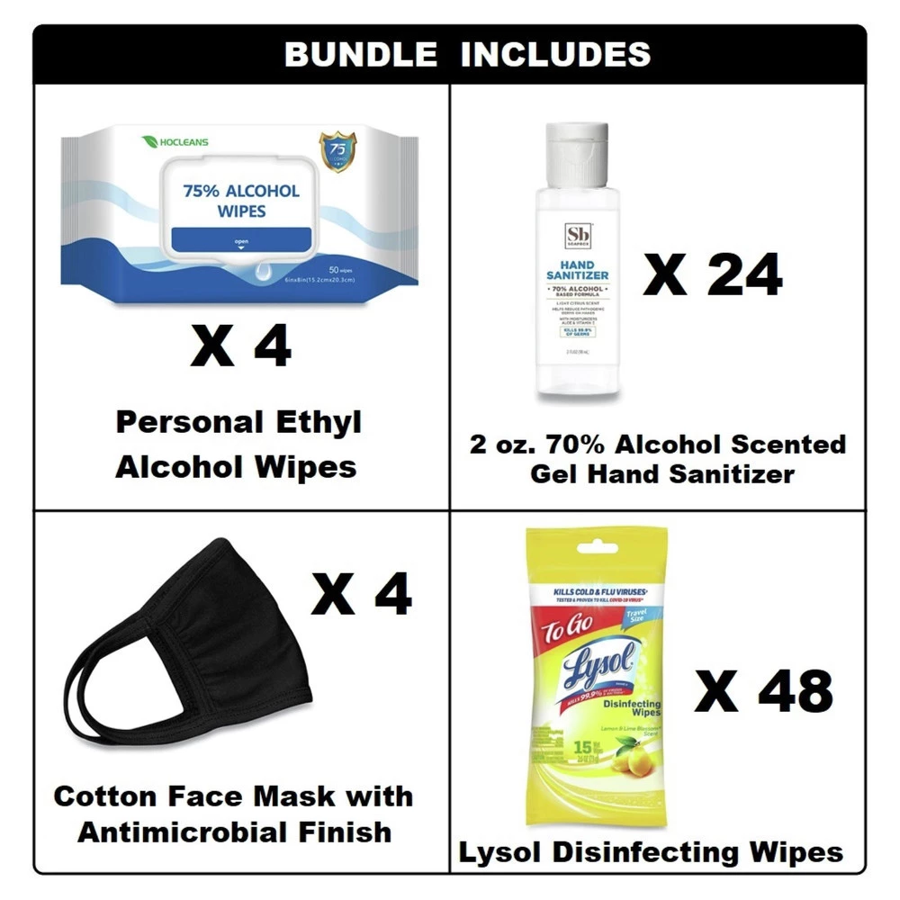 - Pre-moistened hand sanitizing ethyl alcohol wipes